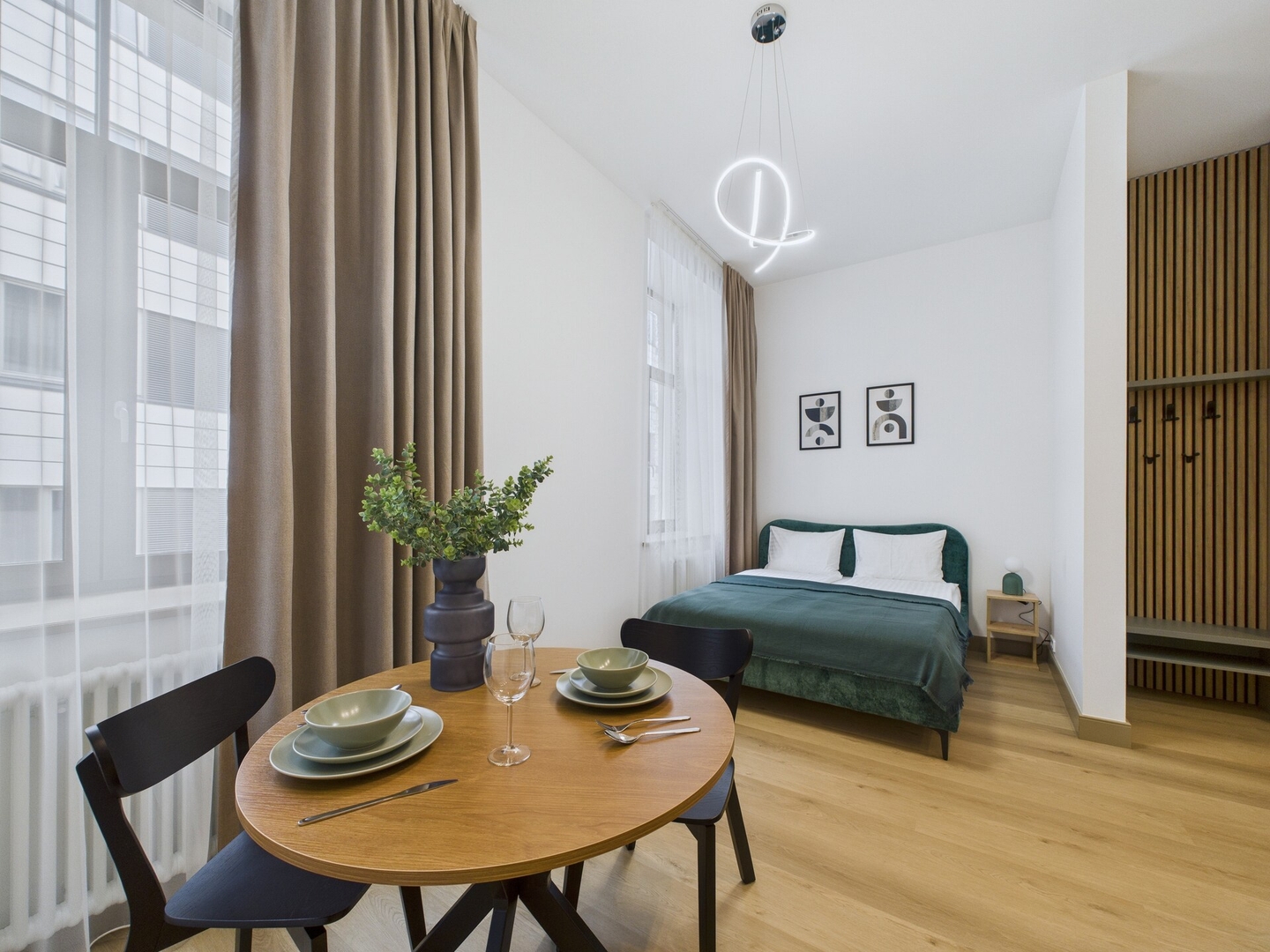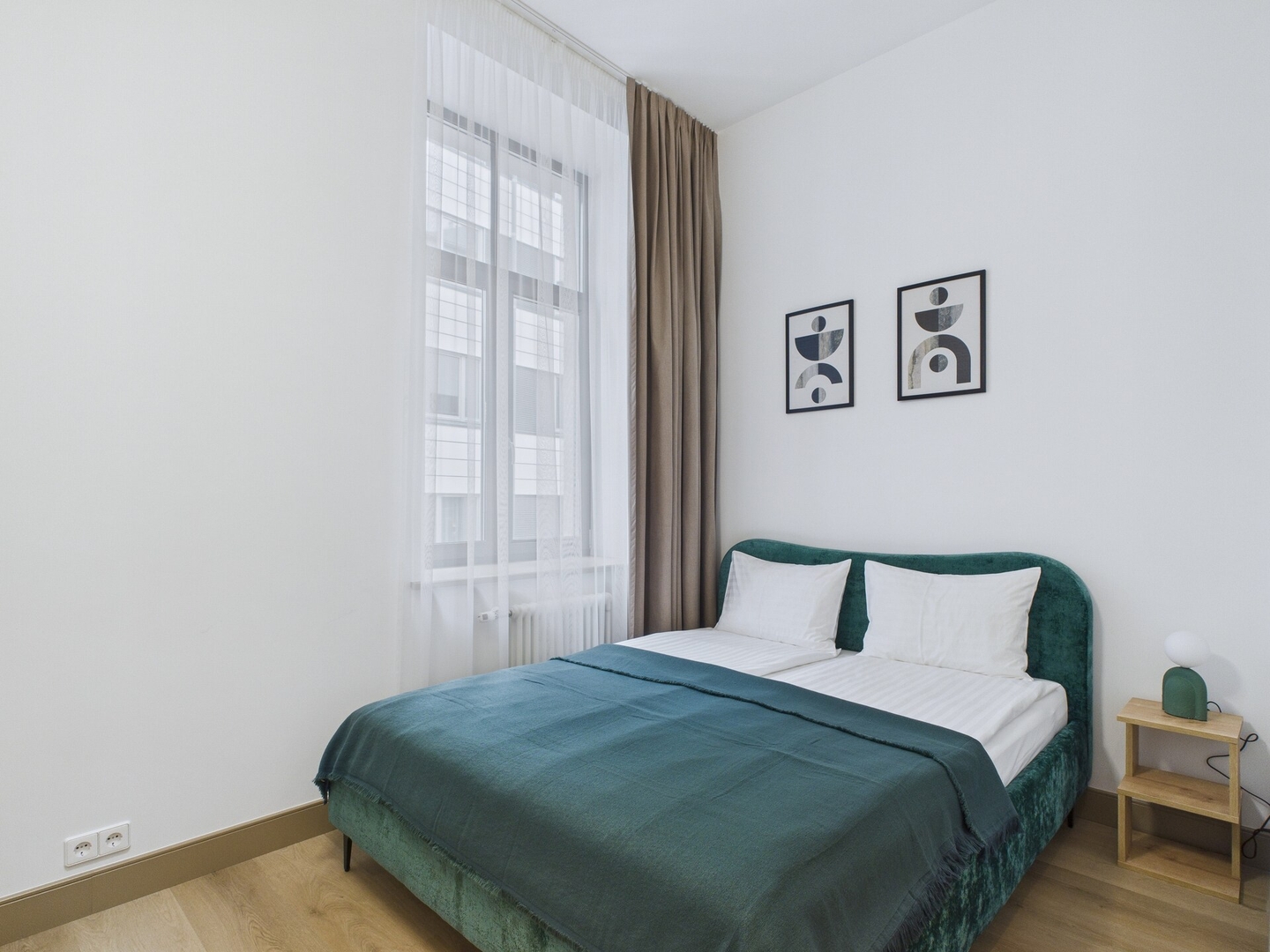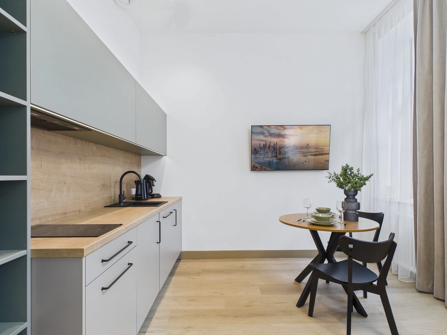 This studio blends modern design with distinctive teal accents and everyday comfort. Set in Place 4, a newly renovated building in the heart of Riga, it sits beside the Central Station, just a short walk from Old Town, with restaurants, shopping, and public transport nearby. The apartment is thoughtfully equipped for both brief city breaks and extended stays.