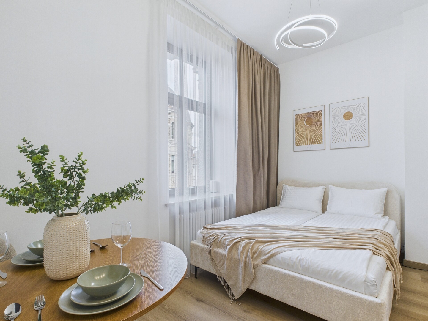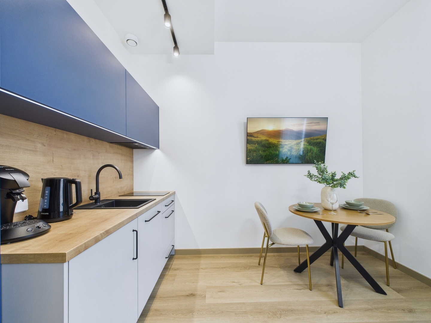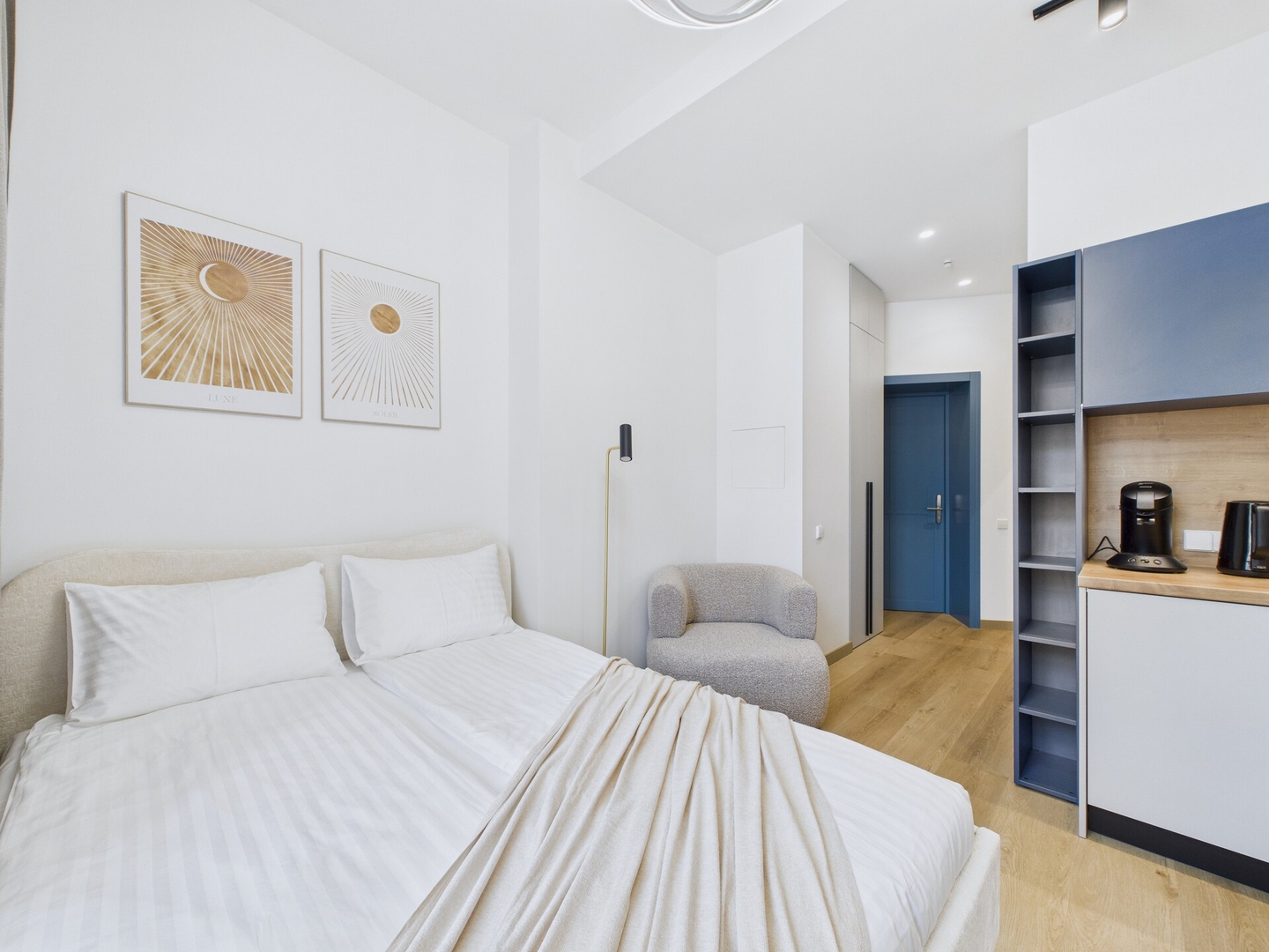 This studio combines a calm neutral palette with soft blue accents and a clean modern design. Located in Place 4, a newly renovated building in the centre of Riga, it stands next to the Central Station and is only a short walk from Old Town, with restaurants, shops, and public transport close by. The apartment is equipped with everything needed for both short visits and longer stays.