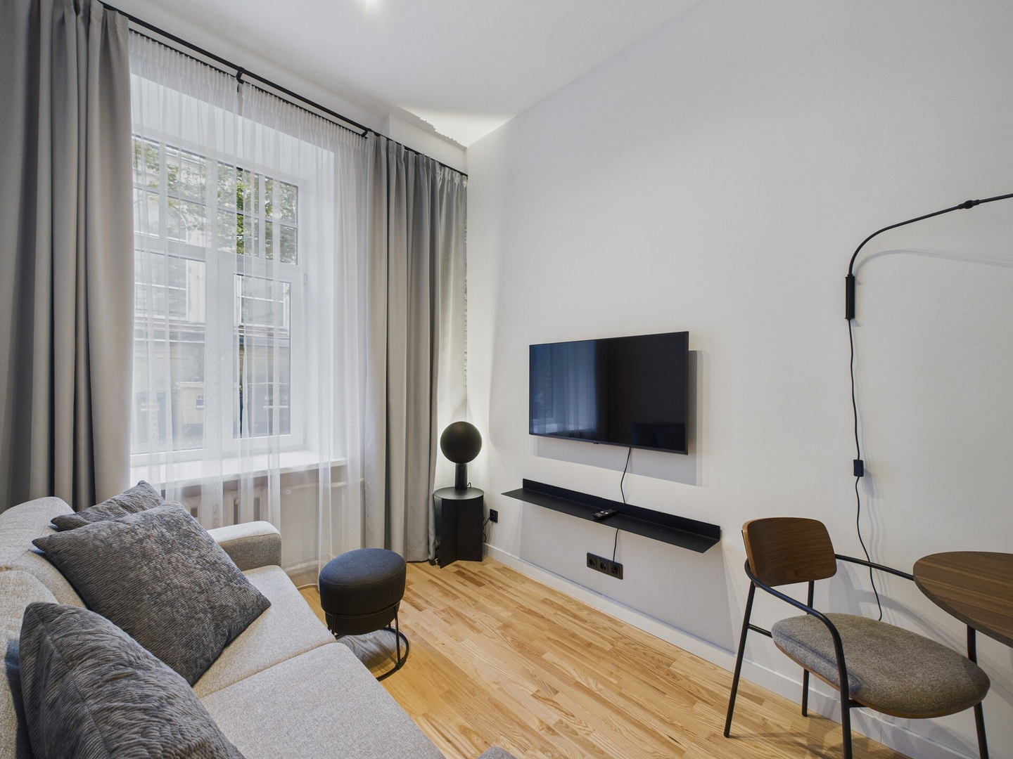 Located in Riga’s city centre, this compact ground-floor studio offers a practical stay within easy reach of restaurants, shops, and public transport. The window faces an inner courtyard, which also serves as a parking area for a neighbouring building — something to keep in mind if you prefer full privacy or a more scenic view.