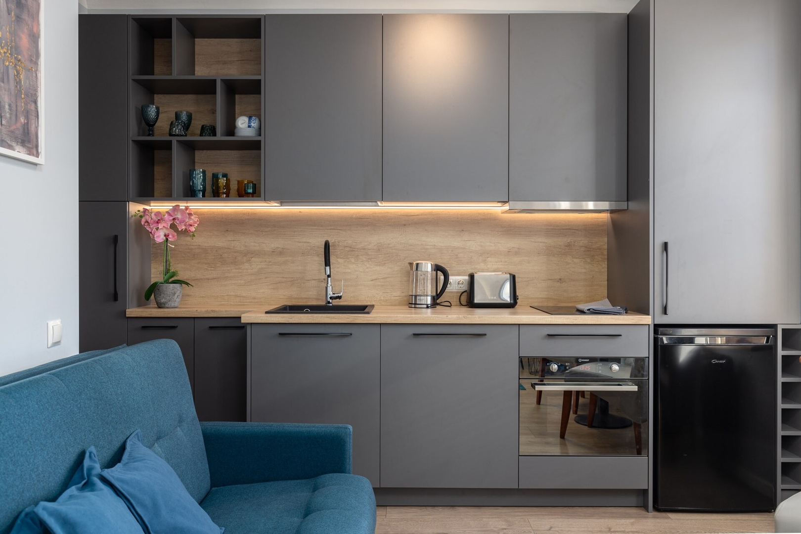 Our studio apartment comfortably accommodates up to 4 guests. You'll find a cozy queen-size bed in the bedroom area, along with a convenient pull-out sofa bed (140cm). The kitchen is fully equipped with a fridge, stove, oven, as well as dishes and cutlery for all your cooking needs. There's also a dining table with three chairs that can double as a workspace for your convenience.