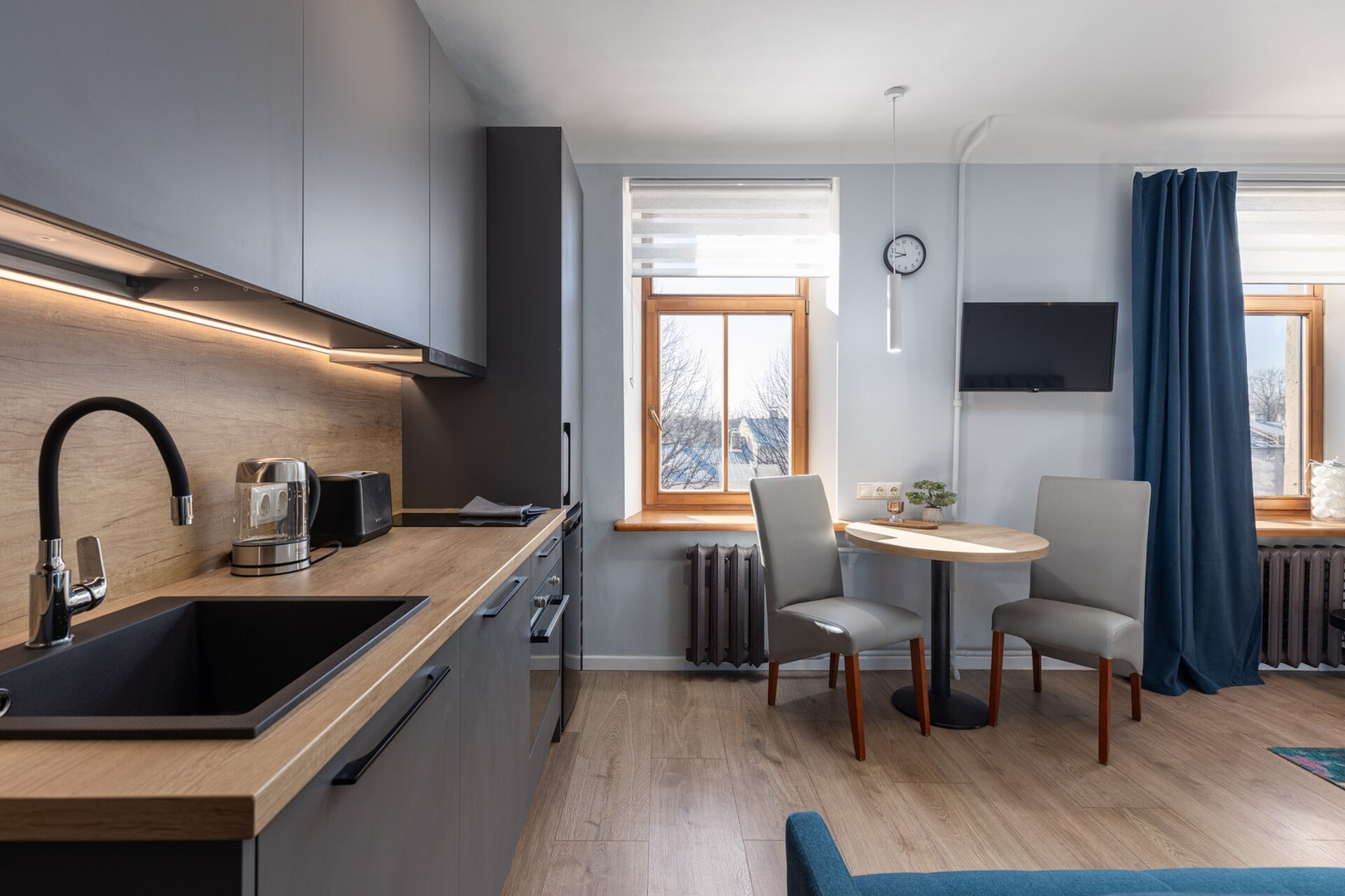 Discover the convenience of our studio apartment in Riga. Our location boasts excellent public transport options, including a 2-minute walk to a bus stop offering less than 30-minute rides to and from the airport. The tram will take you to the Old Town in just 3 minutes, or you can walk across the bridge and enjoy the panoramic views.