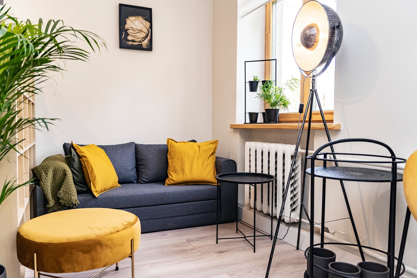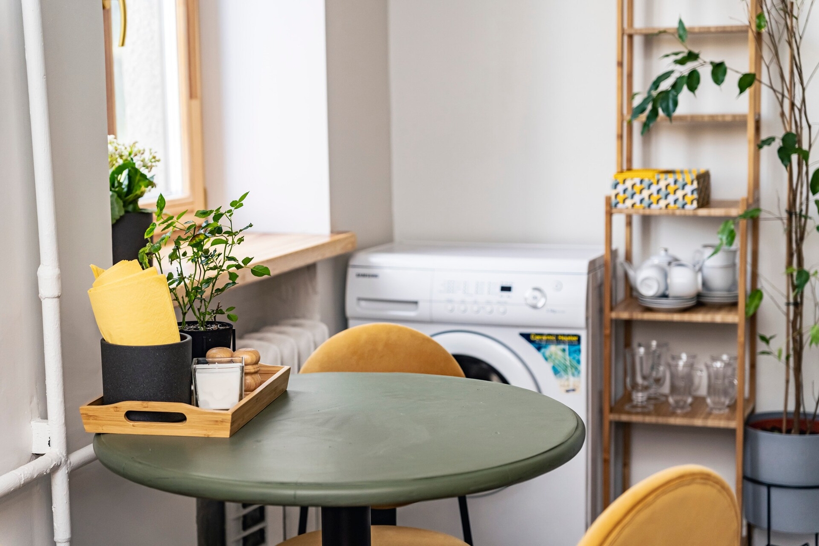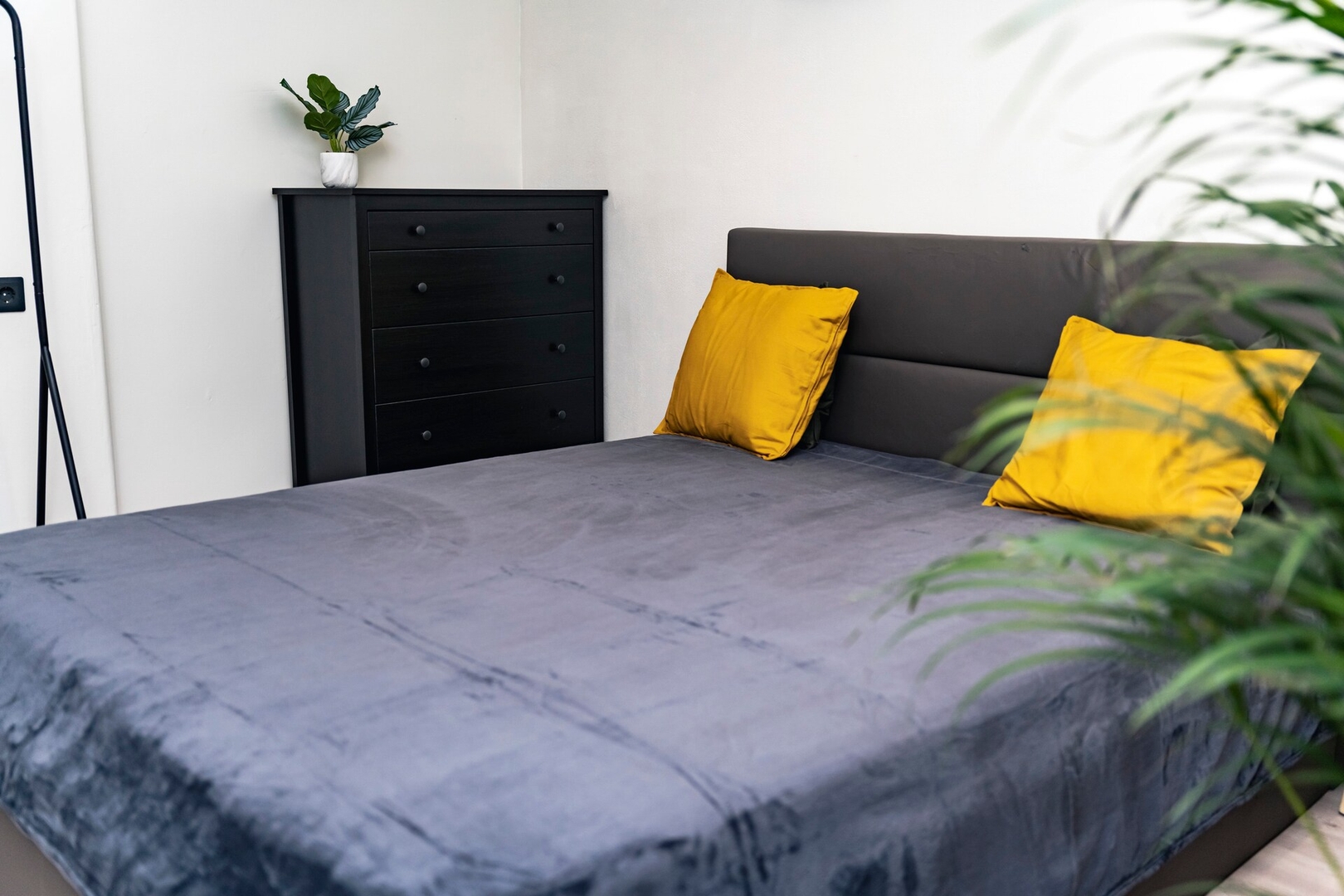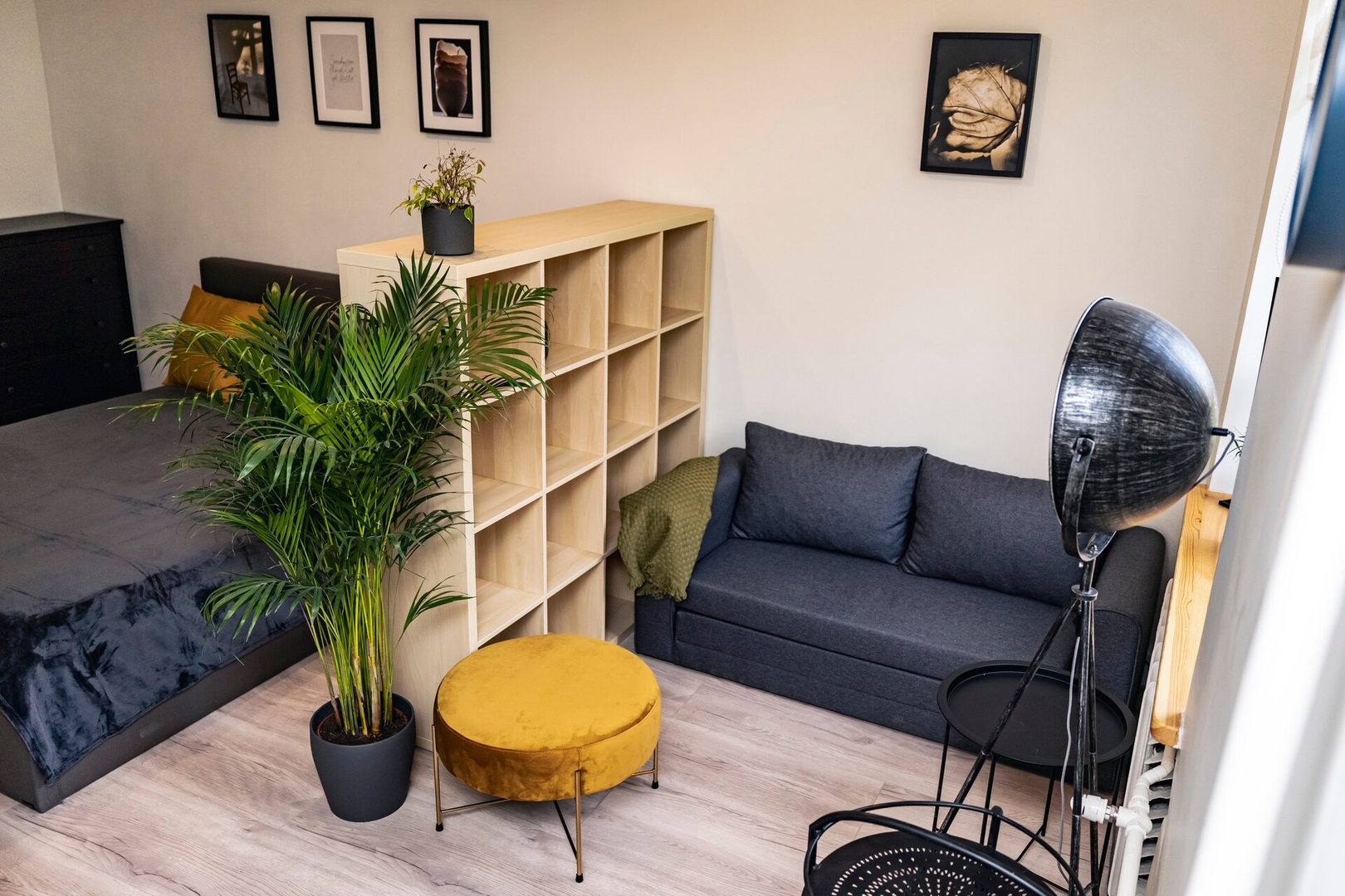 Our studio apartment can comfortably host up to 4 guests. The bedroom area features a cozy queen-size bed, and there's a convenient pull-out sofa bed, perfect for accommodating an adult or two children. The modern design of the apartment separates the bedroom from the kitchen with a wall. The fully equipped kitchen boasts a fridge, stove, oven/microwave combo, as well as dishes and cutlery for all your cooking needs. A dining table with three chairs, which can also serve as a workspace, provides a comfortable spot to enjoy your meals.