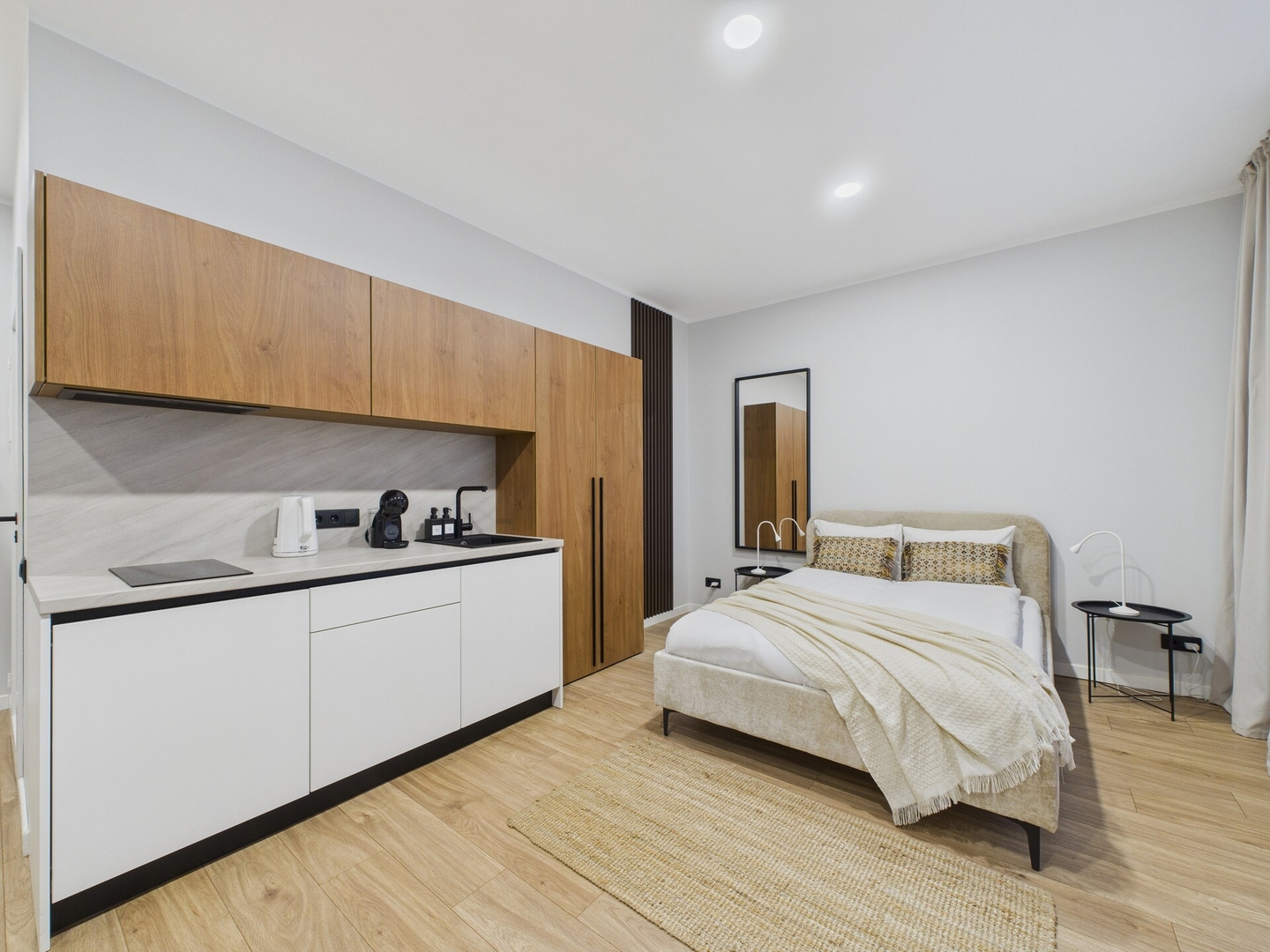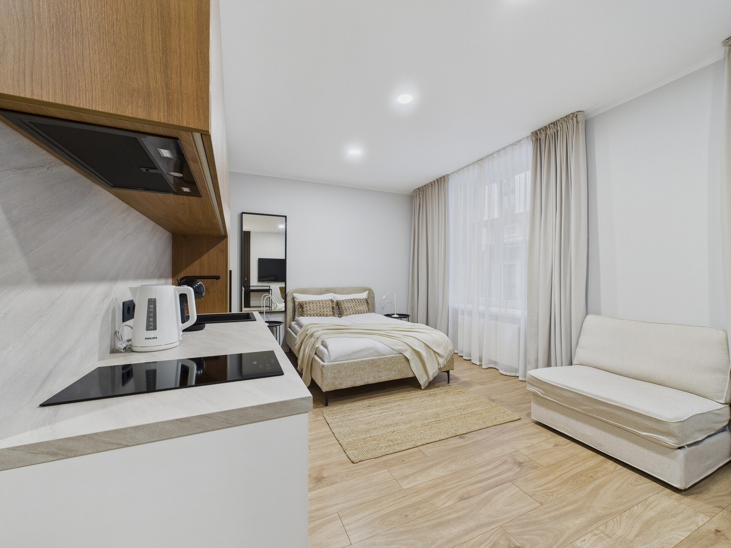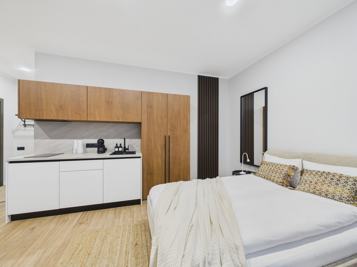 The studio includes a double bed, a fully equipped kitchenette with an induction stove, fridge, microwave, kettle, and Dolce Gusto coffee machine. There’s a dining area for two, smart TV, desk, Wi-Fi, and a private bathroom with a shower, hairdryer, washing machine and iron.