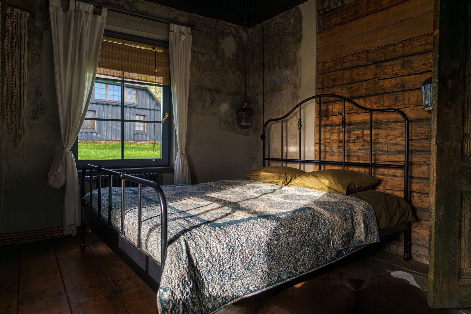 The second floor is a dedicated sleeping area with two antique twin beds that can be joined to form a large double bed. There is also a rest area with table hockey, and space to accommodate two additional mattresses. Parts of the house retain their original floors and feature design furniture.