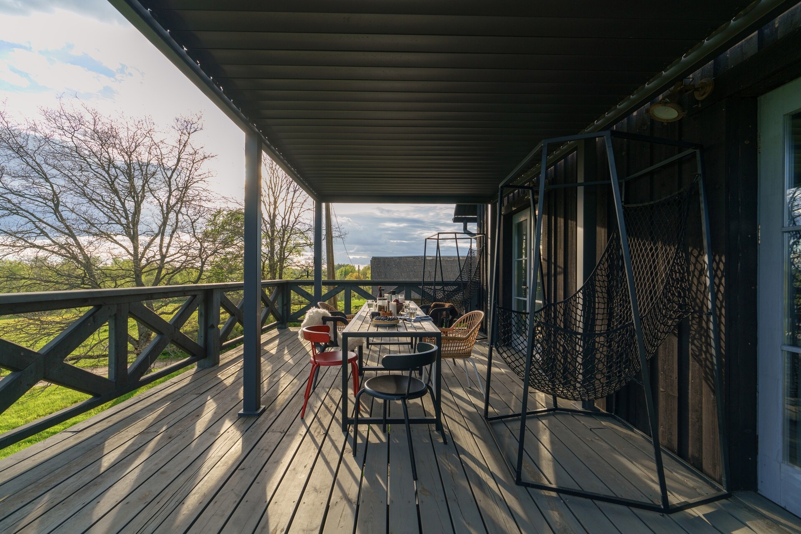 On the first floor, you'll find a spacious living room that opens onto a large 30m² terrace, offering stunning views of the surrounding landscape, ponds, the Ogre River, and an old windmill. The living room is connected to a spacious kitchen, equipped with a refrigerator, stove, and oven. This floor also features two separate bedrooms, each with a double bed, as well as a bathroom with a shower and bath.